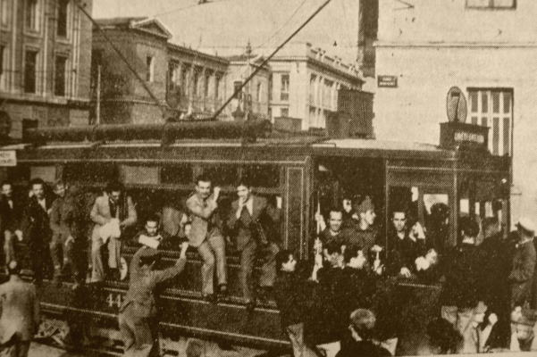 Οι πρώτοι επίστρατοι στριμώχνονται στα τραμ που στρίβει με δυσκολία την οδό Ιπποκράτους, προκειμένου να φτάσουν στο Φρουραρχείο της Αθήνας και από εκεί να προωθηθούν στο μέτωπο.
